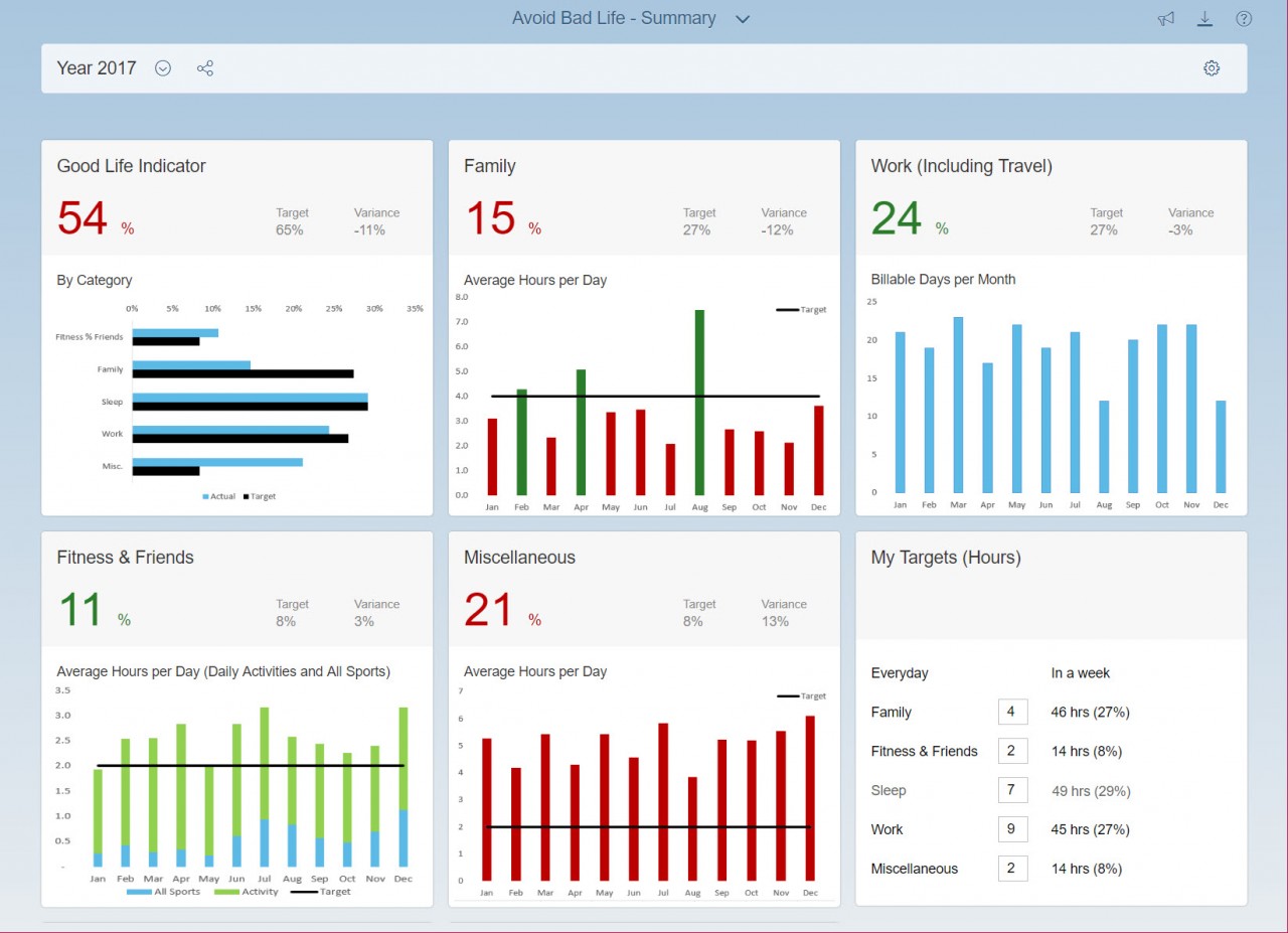 Netti on pullollaan Work-Life Balance artikkeleita. Niissä usein esiintyvästä "Family, friends, fitness, work, sleep - pick three" -mantrasta sai kätevästi kategoriat dashboardiin. Good Life Indicator on KPI:nä tietysti subjektiivinen, mutta nyt se on määritelty seuraavasti: